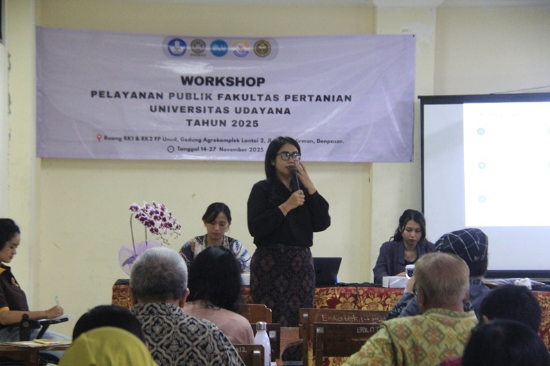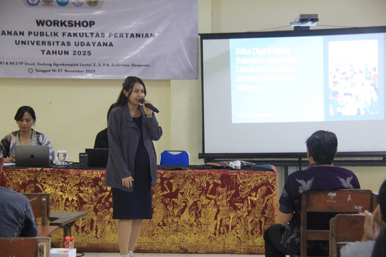 Denpasar - To achieve the Integrity Zone, the Faculty of Agriculture, Udayana University, held a Public Service Improvement Workshop on Friday, November 14, 2025, in Lecture Rooms 1 and 2, Agrokomplek Building, Udayana University, Denpasar. The event featured two speakers from the Communication Studies Program, Faculty of Social and Political Sciences, Udayana University: Dr. Ni Nyoman Dewi Pascarani, S.Si., M.Si., who presented on Human Resources Professionalism, Facilities and Infrastructure, and Information Systems, and A. A. Raka Jayaningsih, S.I.Kom., M.Med.Kom, who presented on Digital Ethics and Technology-Based Academic Services to Achieve a Clean and Serving Bureaucracy.